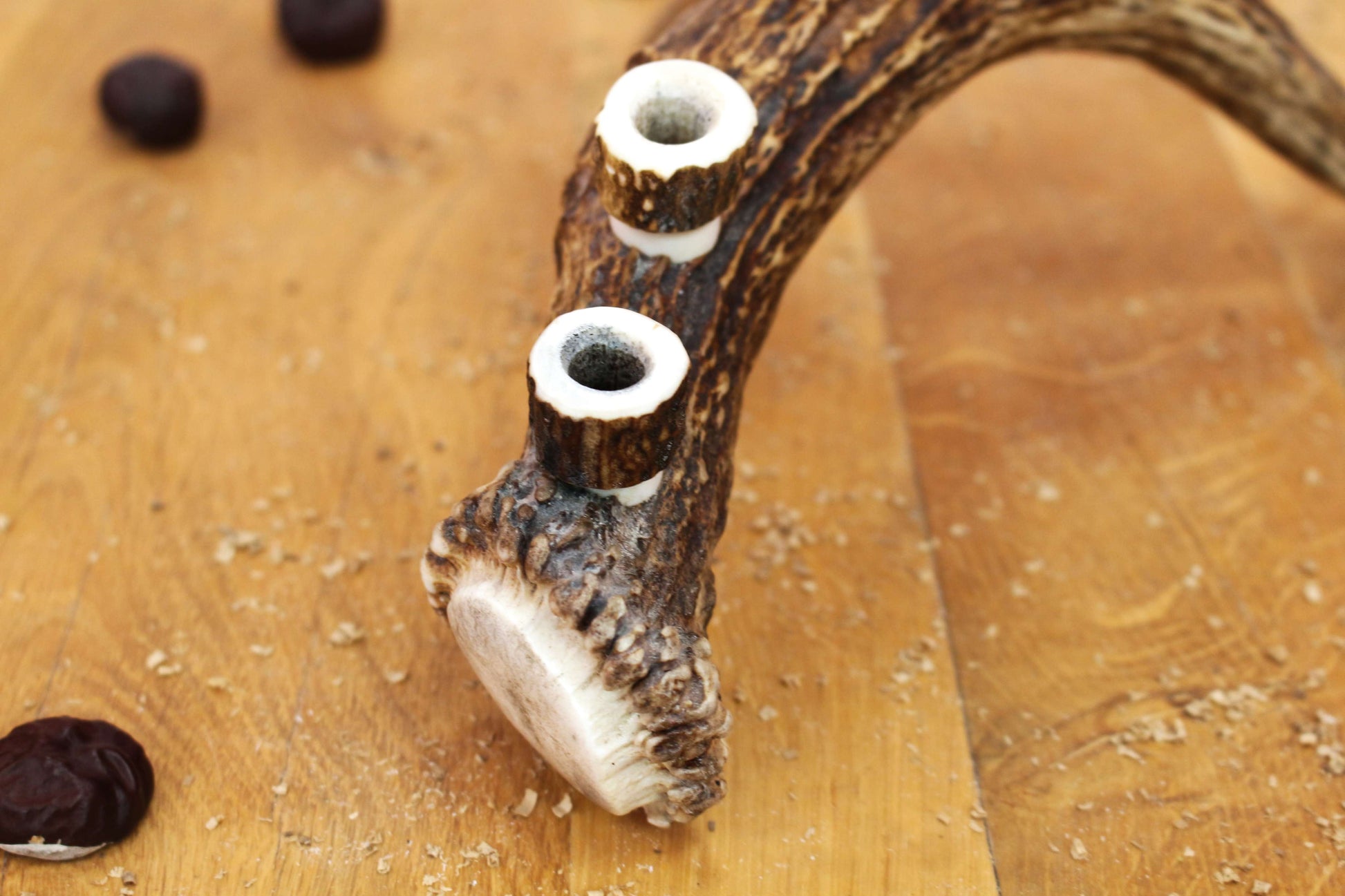 A very unique candlestick holder handmade from moose antler with a flat candle holding part that is 39 mm in diameter. To this candlestick holder we will attach 5 pcs of flat candles so that you wouldn't need to worry where to get more right away. The 2 places for holding pens or pencils are 10 mm in diameter, the whole product weights 513 grams.