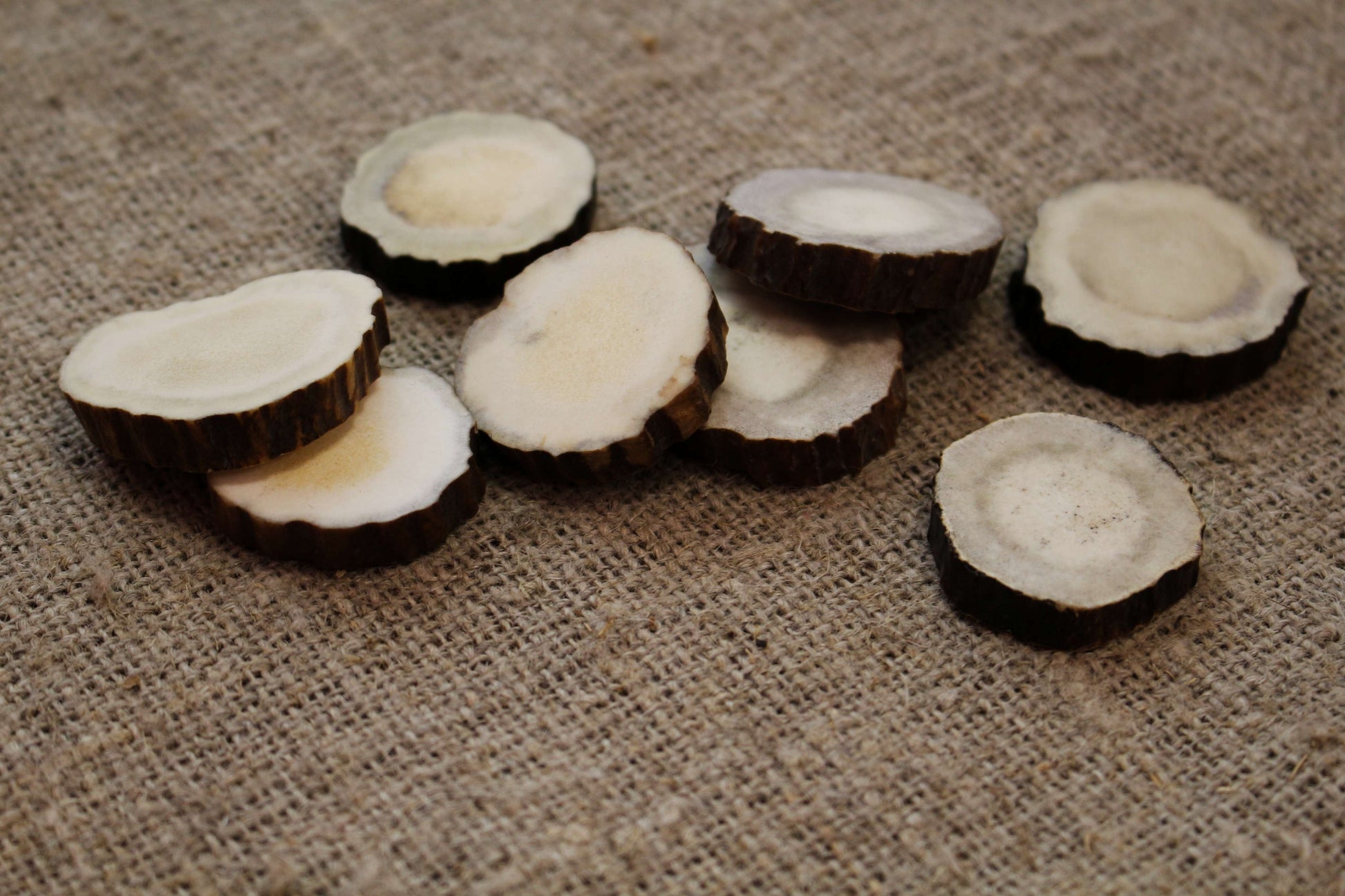 These moose antler slice pieces measure around 30 mm in diameter. shapes as seen in the picture can vary.