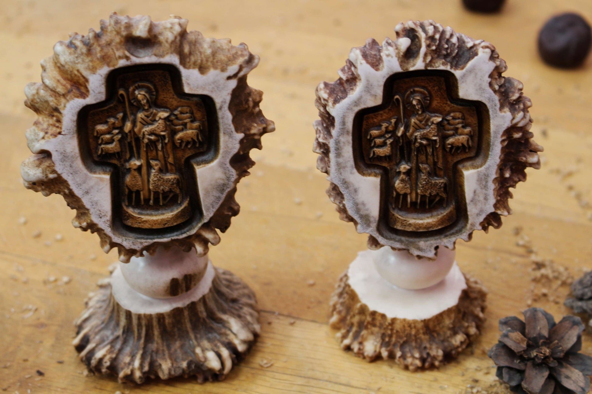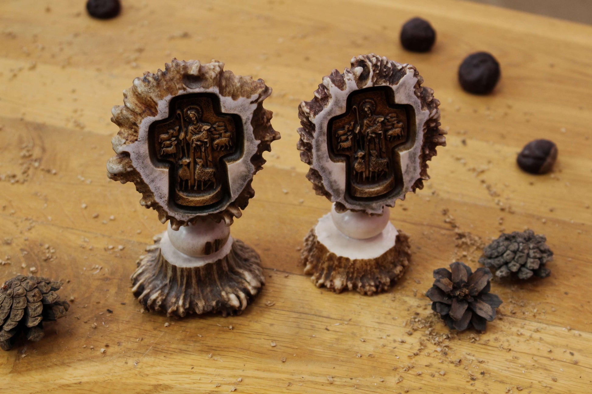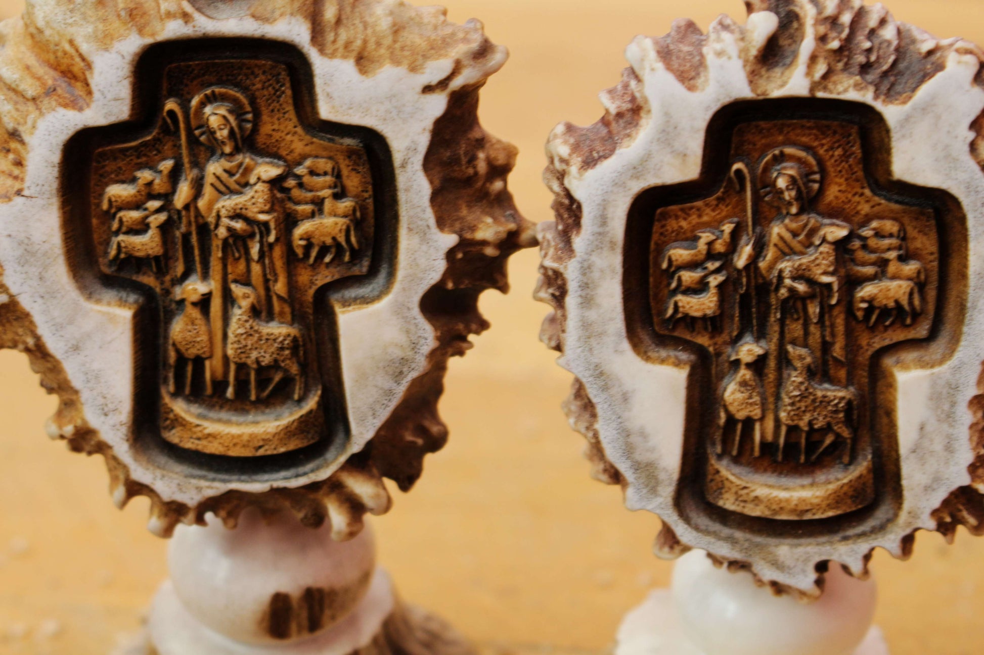 Unique home decor pieces made from real natural moose antler, with engraved Christianity symbolics. 2 pieces are sold separately, very similar in size.